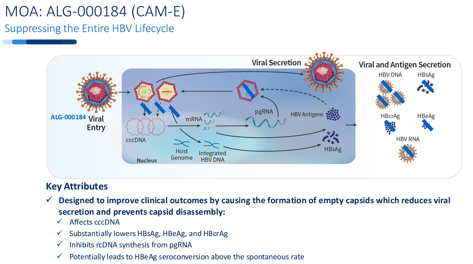 ALG-000184-induced capsids can't disassemble properly. They can't deliver new cccDNA. Over time, the existing cccDNA reservoir isn't replenished. It begins to decay.