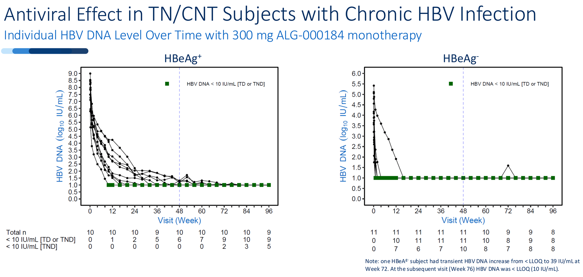 HBV DNA returns quickly in most patients once treatment stops. The cccDNA reservoir wasn't depleted enough. ALG-000184 proves to be an excellent suppressive therapy - potentially superior to tenofovir - but not a cure enabler as monotherapy.