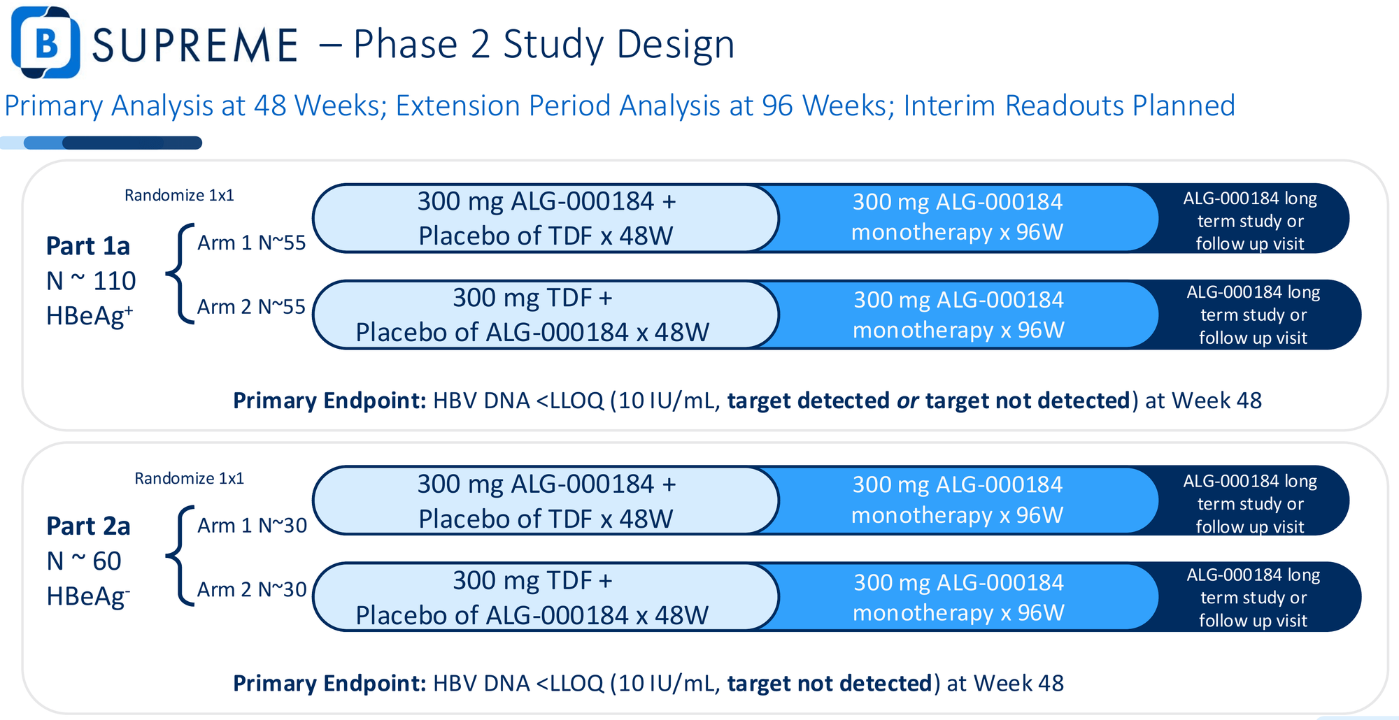 The B-SUPREME trial randomizes roughly 200 treatment-naïve patients 1:1 to receive either ALG-000184 monotherapy or tenofovir for 48 weeks. The primary endpoint: proportion of patients achieving HBV DNA below the lower limit of quantification (target detected or not detected) at Week 48.