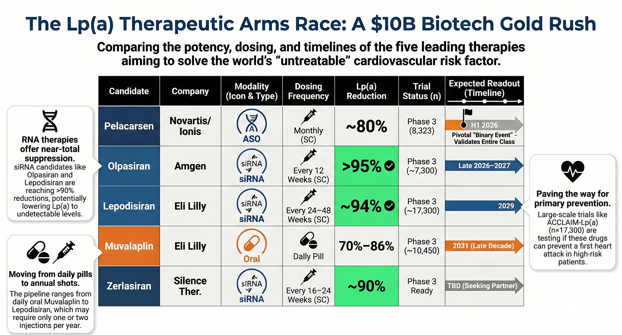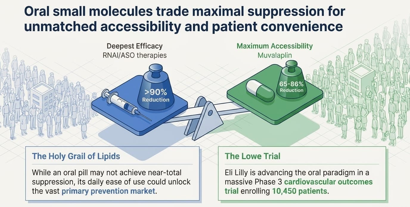 The Lilly thesis: Lilly is simultaneously running two Lp(a) programs with complementary profiles — lepodisiran (injectable, ultra-durable, twice yearly) and muvalaplin (oral, daily pill). This dual-mechanism strategy positions Lilly as the most formidable long-term competitor, with the potential to serve different patient preferences and clinical settings.