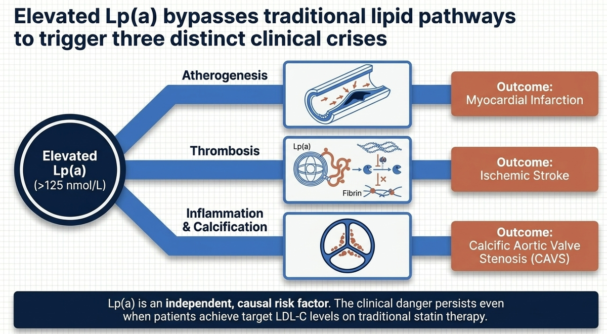 The result: people with high Lp(a) face 1.4× to 2× or more elevated cardiovascular risk depending on levels, even when their LDL cholesterol is well-controlled on statins. At extremely high levels (300–400 nmol/L), the risk is comparable to having heterozygous familial hypercholesterolemia — a genetic disorder that has historically warranted aggressive intervention.