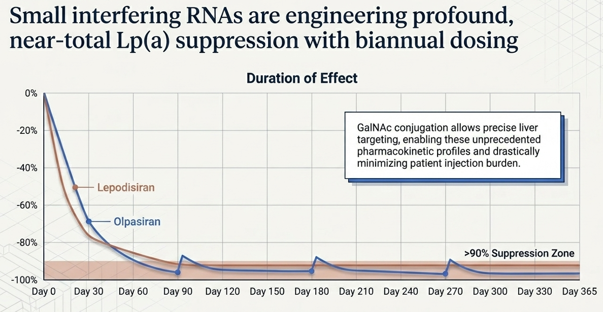 Mechanism: siRNA (small interfering RNA). Where ASOs bind to mRNA, siRNA exploits the cell's natural RNA interference pathway to degrade the apo(a) mRNA — think of it as programming the cell's own demolition crew to target and destroy the instruction manual for making apo(a). Delivered via GalNAc conjugate — a sugar molecule that acts as a liver-targeting GPS — allowing infrequent dosing. Amgen's Phase 2 dose selected: 75 mg every 12 weeks (quarterly injection).