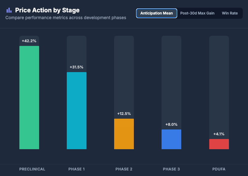 When we isolate the 30-day pre-catalyst window, a clear inverse correlation appears between clinical stage and anticipation returns.
