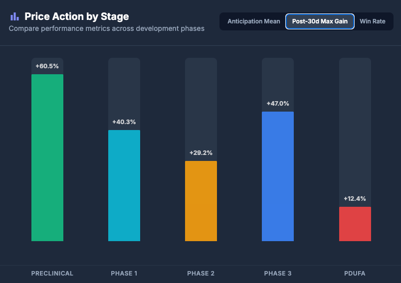 Counter-intuitively, Phase 3 and PDUFA wins often generate lower immediate percentage returns than early-stage surprises.